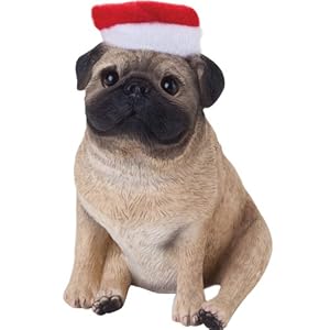 - Sweetly expressive and extremely life-like sitting fawn pug all dressed for the holidays in a festive santa hat