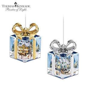 - Exquisitely crafted in shimmering clear crystalline, this charming set of gift-shaped Christmas ornaments features Thomas Kinkade's festive imagery and fully sculpted and hand-painted villages