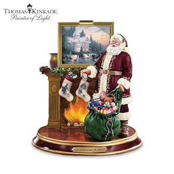 Thomas Kinkade Santa Figurine - Handcrafted Limited Edition Lights Up Your Holidays! Full of Wonderful Details! - Now, just in time for the holidays, here's a classic Santa that shows you Christmas as envisioned by the Painter of Light(TM). "The Light of Christmas," from Thomas Kinkade, is a first-of-a-kind illuminated Santa figurine featuring his artwork - exclusively from Bradford Editions! The picture over the fireplace, the stockings, even the ornaments are decorated with Thomas Kinkade's art. And, it lights up! At the flick of a switch, cheerful light glows from the fireplace and above the Thomas Kinkade artwork. Plus, the rich golden colors, nameplate and handsome base add ideal finishing touches. Share Thomas Kinkade's vision of Christmas, but hurry! His work is in intense demand and quantities are limited, so order now.